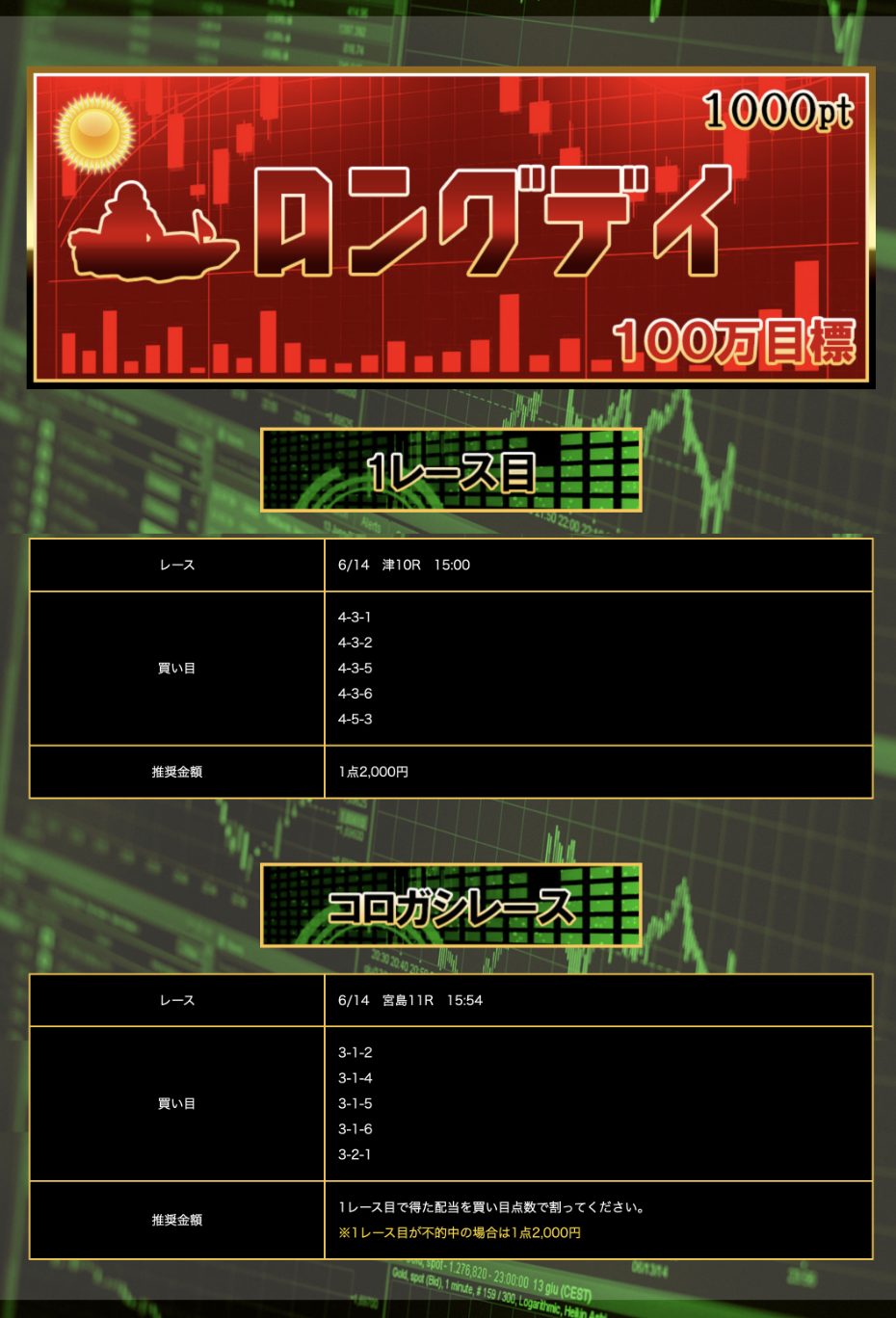 「ロングデイ」の 買い目は3連単で5点提供され、推奨金額は1点あたり2千円で合計1万円の購入になります。