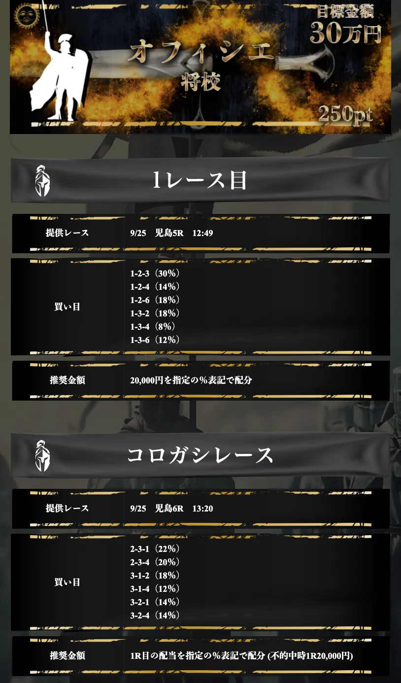 今回は「オフィシェ」で実践。 買い目は3連単で8点以内の提供だ。そして今回の買い目は6点になっており、推奨金額は2万円。※買い目によって金額が異なる。