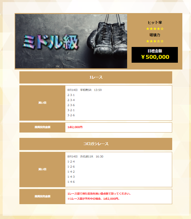 ≪ミドル級≫の買い目は3連単で5点提供され推奨金額は1点あたり2千円で合計1万円の購入になります。そして、8月14日に購入した買い目はこちらです。