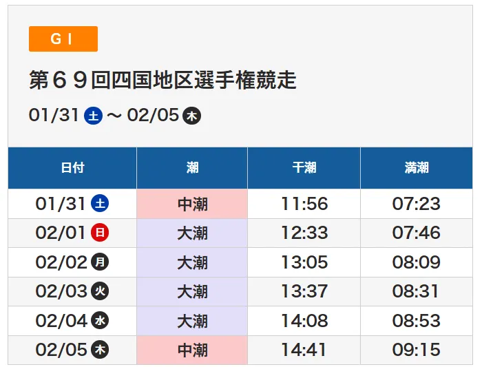 これらが複合して、同じコースでも回るタイミングで有利不利が変わるため、潮回りの把握は重要です。そして今回【第69回四国地区選手権競走】での潮見表はコチラ!